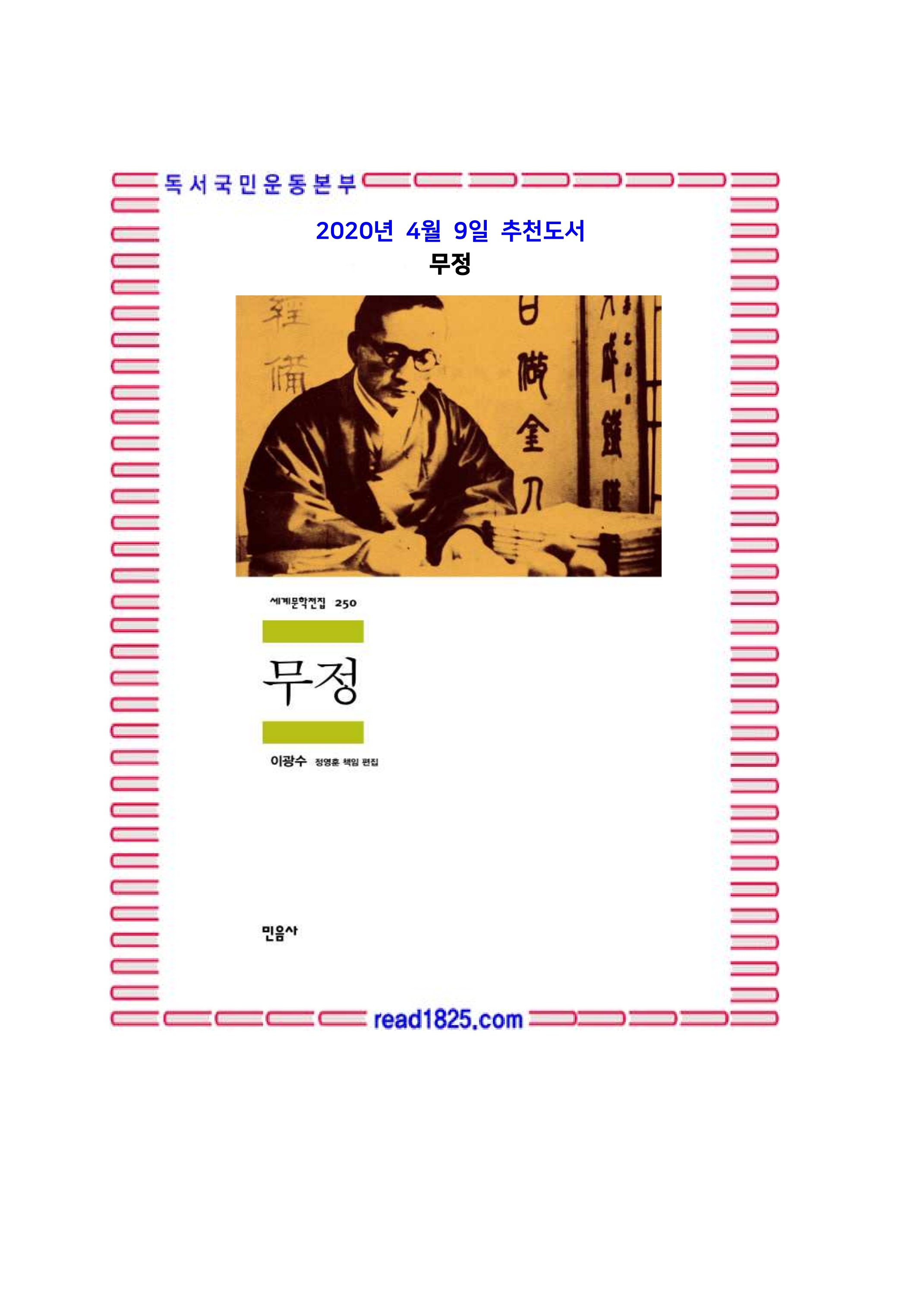 이광수는 능동적으로 자신의 사랑과 운명을 결정하는 법을 배워 가는 청년들이 조선의 앞날을 새롭게 써 나가기를 희망했다. 각각 미국으로, 일본으로 떠나는 기차 안에서 우연히 만난 형식과 선형, 영채는 끔찍한 수해 현장을 목격하고 조선의 앞날을 걱정한다. 그리고 그들은 ‘교육으로, 과학으로’ 조선 민중을 계몽해야 한다는 깨달음에 이른다. 유학에서 돌아온 주인공들 앞에는 ‘문명한 조선’이 기다리고 조선은 그들의 도움으로 발전해 나갈 것이다. 이렇듯 조선의 미래를 희망적으로 그린 『무정』의 결말은 이광수의 간절한 기대이기도 했다. 비록 이광수의 이러한 꿈은 현실이 되지 못했지만, 시대의 한계 속에서 그가 실현해 냈던 문학적 성취는 지금까지도 생생하게 살아 숨 쉬고 있다.