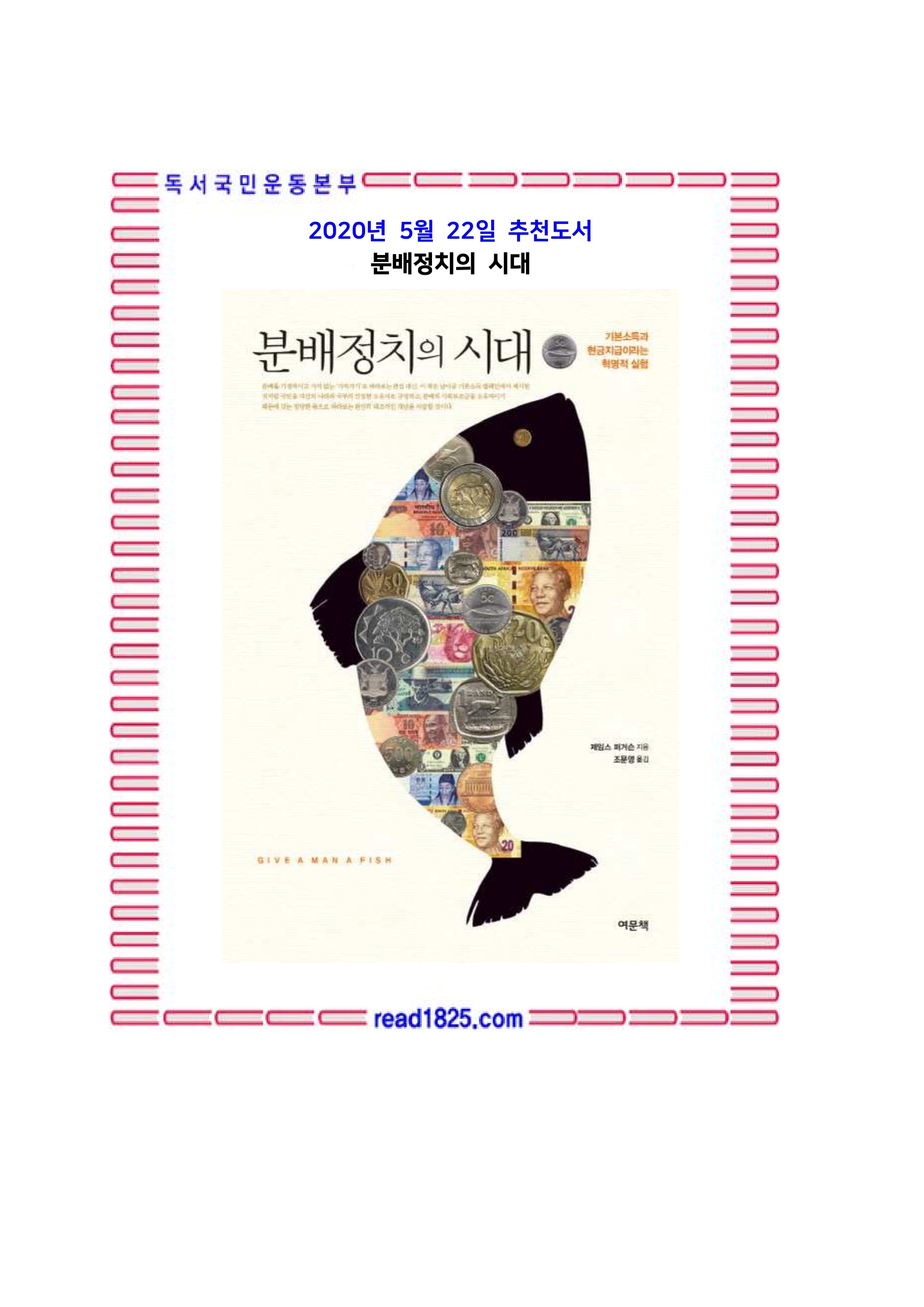 ‘개천의 용’이 나는 시대는 끝나고 있다. 국가권력이 체계적으로 일자리를 없애고 있는 시점에 “일하지 않으면 먹지도 말라”는 말은 또 누가 왜 자꾸 하는 걸까? 게다가 지금 대부분의 일자리는 따지고 보면 지구를 망치는 일들이다. 풍요의 시대에 굶어죽을지도 모른다는 공포를 안고 살아가는 국민들이 늘어나고 있다. 일/노동과 소득에 대한 개념이 근본적으로 바뀌지 않으면 미래는 참담하다. 퍼거슨은 이 책에서 신자유주의 돌풍의 와중에 남아프리카공화국과 나미비아 등지에서 시도한 기본소득 사례연구를 통해 우리가 지향할 새 사회에 대한 그림을 보여주고 있다. 그는 “물고기 잡는 법”을 가르치려 들지 말고 “물고기를 주라”고 말한다. 국민들이 최소한의 삶을 꾸려낼 현금을 갖게 되는 것, 이를 통해 ‘상호부조’의 자생적 사회가 살아나게 하자는 것이다. 유럽과는 다른 경로로 등장한 남아프리카의 ‘새로운 복지국가’의 모습을 자세히 들여다보면 우리가 가야 할 길이 보인다. 본격적으로 기본소득과 시민배당에 대한 논의와 실험을 할 때가 무르익고 있다.