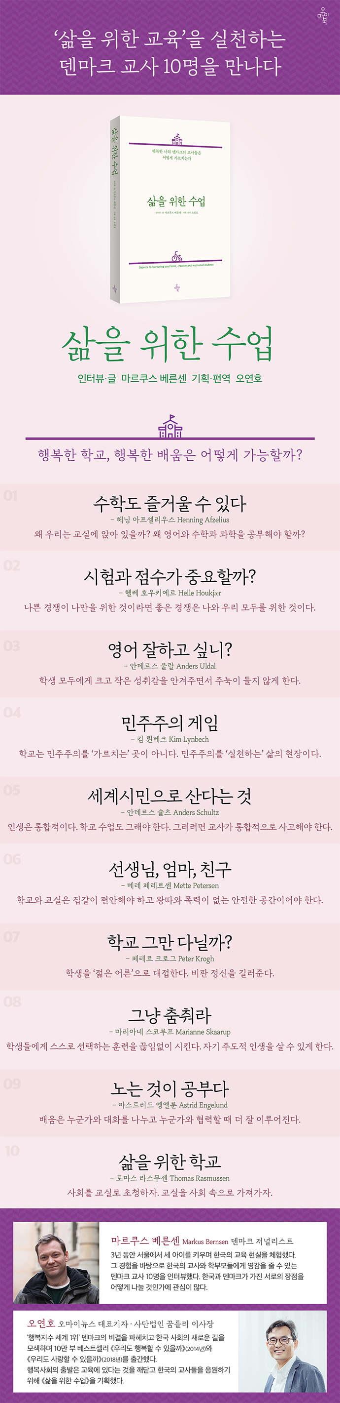 우리도 ‘삶을 위한 수업’을 할 수 있을까? 북유럽 스칸디나비아에서 가장 큰 주간지 〈웨켄다비센(Weekendavisen)〉의 기자 마르쿠스 베른센은 2014년부터 3년 동안 한국 특파원으로 활동했다. 그는 주한 덴마크 대사관에서 일하는 아내와 함께 서울에서 세 아이를 키우면서 덴마크, 북유럽과는 너무나 다른 한국의 교육 현실을 체험했다. 베른센 기자는 한국을 사랑했지만, 교육 문제에 있어서는 한국에서 아이들을 키우고 싶지 않다는 생각이 강하게 들었다.