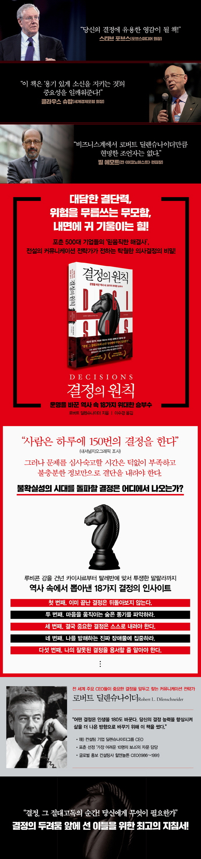 이에 미국의 전설적 커뮤니케이션 전략가 로버트 딜렌슈나이더(딜렌슈나이더그룹 설립자이자 회장)는 이러한 불확실성의 시대에도 최선의 선택을 위한 불변의 원칙이 분명 존재한다고 강조한다. 《결정의 원칙》은 포춘 500대 기업을 자문하고 수만 명의 리더를 만나면서 그들이 느끼는 결정의 두려움에 누구보다 깊이 공감해온 딜렌슈나이더가 역사의 판도를 바꾼 18가지 위대한 결정의 정수를 담은 책이다.