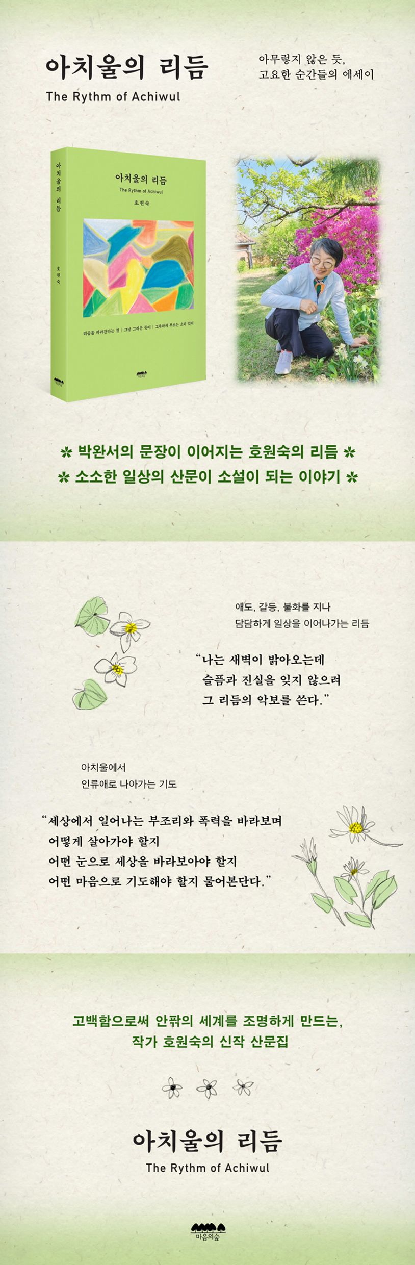 리듬은 자신의 삶을 정확히 알 때 자연스럽게 드러난다. 내가 살아온 환경, 내가 영향 받았던 존재, 내가 현재 영향 받고 있는 존재를 정확히 알 때 언어로써, 삶으로써 리듬이 나온다. 호원숙 작가는 자신만의 리듬으로 글을 쓰고 자신만의 세계관을 구축해낸다. 아치울에서 지냈던 향토가 묻어나고 사물이 등장하고 그에 따른 마음이 드러난다. 이 책을 읽을 독자들은 아마도 호원숙 작가만이 그려내는 세계관에 따스함을 느끼기도 할 것이고, 또 아련한 감정을 느끼기도 할 것이다.