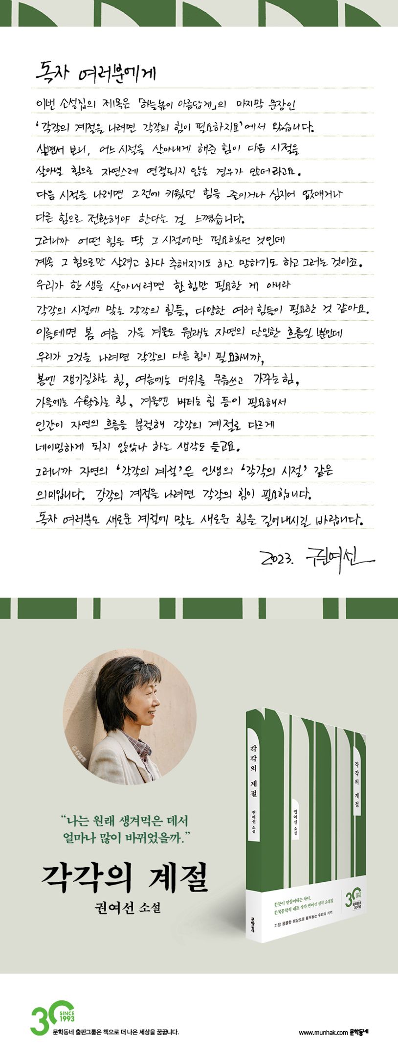 서로를 이어주는 수천수만 가닥의 실을 끊는 것이 아니라 밧줄로 꼬아 더 단단하게 연결하기. 뜻밖이면서 자연스러운 이 전환은 계절의 변화를 닮아 있는 듯하다. 계절이 달라지면 필요한 힘도 달라지듯이 두 사람은 이제 그전과는 다른 시선으로 서로를 바라보게 될 것이다. 그리고 그렇게 했을 때 비로소 자신들 앞에 과거와는 다른 새로운 계절이 펼쳐지는 모습을 볼 수 있게 될 것이다. 우리가 시간의 연결된 흐름을 봄, 여름, 가을, 겨울이라고 구분함으로써 현재의 계절을 마무리하고 다음 계절로 넘어가는 힘을 얻을 수 있는 것처럼 권여선이 우리에게 건네는 건 지금 필요한 새로운 계절, 그러니깐 ‘각각의 계절’인 듯하다.
