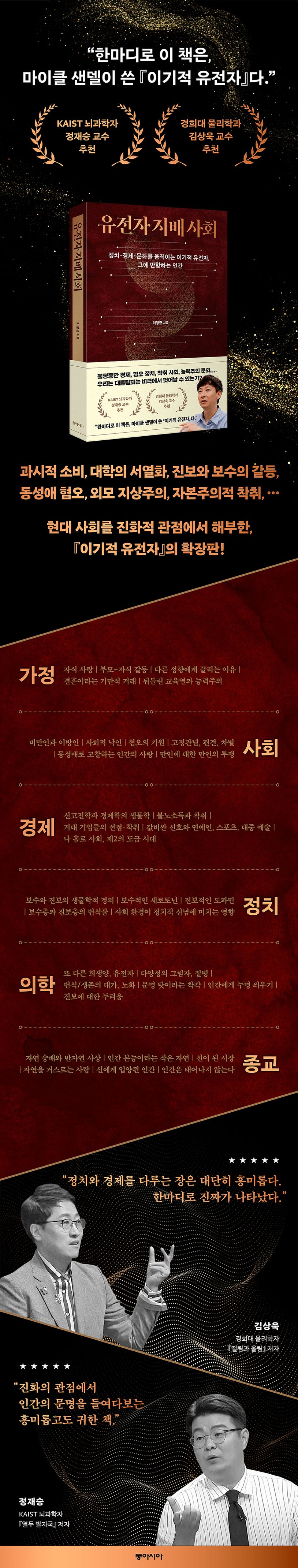 리처드 도킨스의 『이기적 유전자』가 출간된 지 거의 50년이 흘렀고, 남녀의 사랑을 파헤친 『욕망의 진화』가 출간된 지도 무려 30년이 지났다. 그러나 그동안 진화나 유전자의 관점에서 가정, 정치, 경제, 사회, 문화 전반에 대해 소개하는 책은 사실상 없었다. KAIST 바이오및뇌공학과 교수이자 인간유전체학자인 저자는 이에 대한 문제의식을 가지고, 《네이처》, 《사이언스》, 《셀》 등 유수 학술지들에 실린 최신 연구들을 바탕으로 오늘날의 불평등한 경제, 혐오 정치, 착취 사회, 능력주의 문화를 해부한다. 구체적으로, 유전자가 심어놓은 인간의 생존 본능과 번식 본능이 어떻게 왜곡된 짝짓기 욕망과 뒤틀린 자식 사랑으로, 혐오와 사회적 낙인으로, 과시적 소비와 착취 행태로, 기득권 체제에 대한 정당화로, 과학의 진보에 대한 막연한 두려움으로, 자연이 아름답고 숭고하다는 착각 등으로 위장되어 온갖 불행과 사회 부조리를 초래하는지를 고발한다. 더 나아가, 인간이 이기적 유전자들을 무의식적으로 따르는 데서 발생하는 이러한 갖가지 비극으로부터 우리가 벗어날 수 있는 길을 모색한다.
