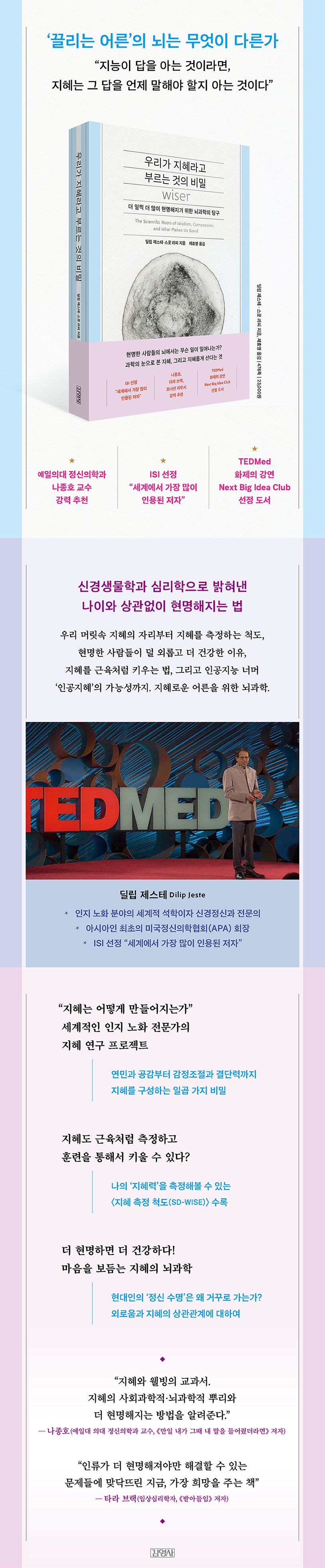 20년 이상 ‘건강한 노화’와 ‘지혜’를 함께 연구하며 “세계에서 가장 많이 인용된 저자”(ISI)로 선정된 인지 노화 분야의 세계적 석학이자 신경정신과 전문의인 저자가 신화와 종교에서 주로 다뤄지던 지혜를 과학의 자리로 옮겨온다. 노화, 외로움, 행복 등 현대사회의 다양한 정신건강 이슈 또한 새로이 통찰한다는 점에서 지금 우리의 몸과 마음, 그리고 개인과 사회에 반드시 필요한 책이다.
