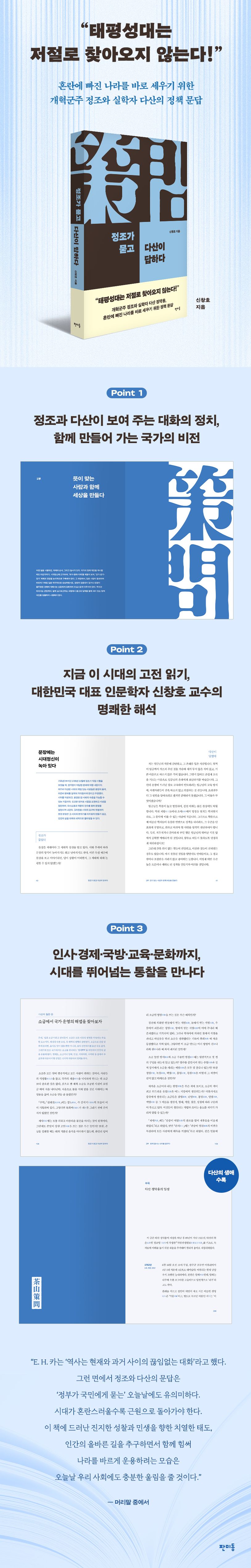 “역사학자 E. H. 카는 “역사는 현재와 과거 사이의 끊임없는 대화”라고 했다. 개혁군주 정조와 실학자 다산의 정책 문답은 그런 면에서 지금 대한민국의 현실에서도, 정부가 국민에게 묻는 오늘날의 시대에도 그들의 사상은 유의미하다. 시대가 혼란스러울수록 근원으로 돌아가야 한다. 이 책에 드러난 진지한 성찰과 민생을 향한 치열한 태도, 인간의 올바른 길을 추구하면서 함께 힘써 나라를 바르게 운용하려는 모습은 혼란스러운 오늘날 우리 사회에도 충분한 울림을 줄 것이다.” - 머리말 중에서