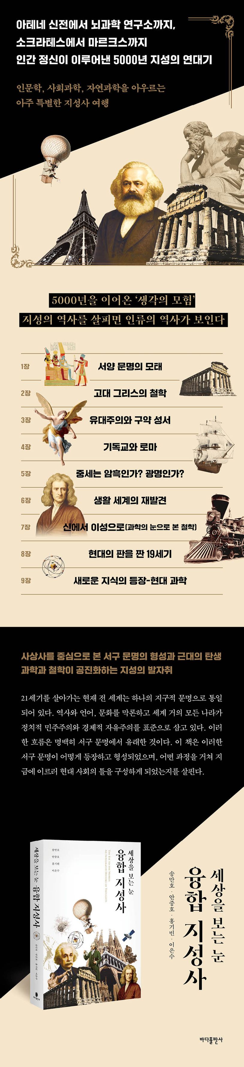 대중의 ‘과학하기’와 ‘과학 이해하기’가 하나의 문화가 되는 사회를 지향하는 유미과학재단의 송만호 이사장과 〈과학오디세이: 유니버스&라이프〉의 저자 안중호 교수가 2022년 《사피엔스의 깊은 역사》를 펴낸 데 이어 이번에는 글로벌정치경제연구소 홍기빈 소장, 서울대학교 철학과 이은수 교수와 더불어 인문학, 사회과학, 자연과학을 아우르는 학문 간 융합을 통해 인류 사상의 역사를 탐험한다. 《사피엔스의 깊은 역사》가 ‘융합과학’의 관점에 따라 우주의 탄생에서 현생 인류 호모 사피엔스까지 이어지는 이야기를 들려주었다면, 이 책은 ‘융합지성사’의 관점에 따라 현생 인류 역사의 마지막 부분을 다룬다. 인문학과 사회과학, 자연과학을 아우르는 학문 간 융합적인 시각에 따라 고고학에서 시작해 철학과 사상의 흐름, 정치적 사건과 경제적 파급효과를 한데 엮고, 인류 사상사를 빛낸 각 시대의 철학을 현대 과학의 지식에 비추어 살펴본다.