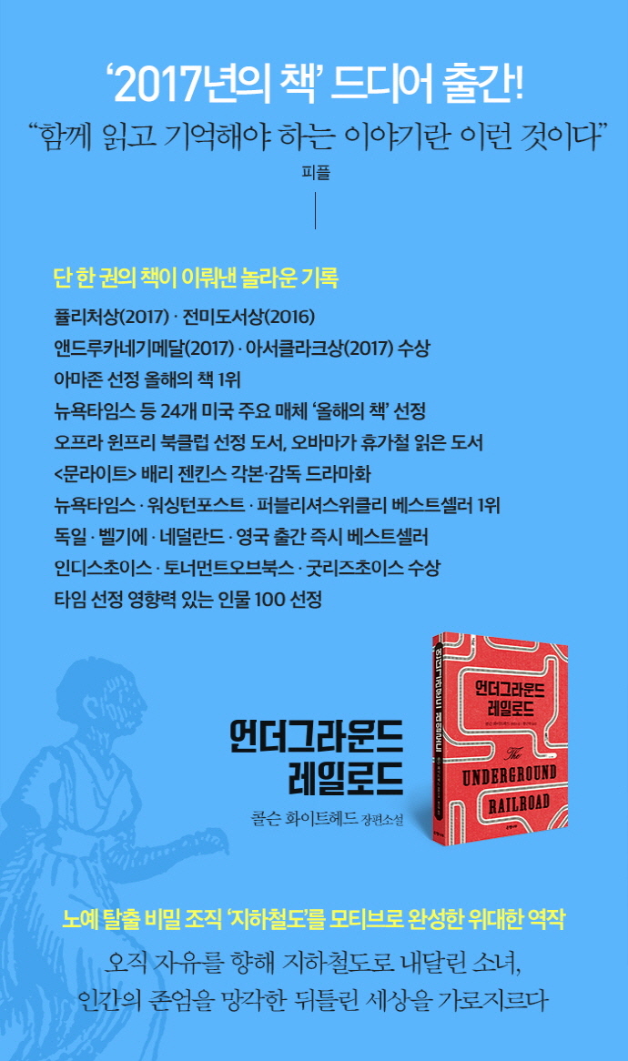 1993년 애니 프루의 《시핑 뉴스》이후 24년 만에 퓰리처상과 전미도서상을 동시에 수상한 콜슨 화이트헤드의 장편소설 『언더그라운드 레일로드』. 앤드루카네기메달, 최고의 SF소설에 주어지는 아서클라크상까지 받으며 한 해 영미권 작가에게 주어지는 거의 모든 영예를 누린 콜슨 화이트헤드의 여섯 번째 소설이다. 출간과 동시에 오프라 윈프리 북클럽으로 선정되었고, 오바마 전 대통령이 노예제도가 과거부터 현재까지 얼마나 우리에게 정신적으로 영향을 미치고 있는지 보여주는 책이라고 극찬하며 휴가철 읽은 책으로 소개하기도 했다.