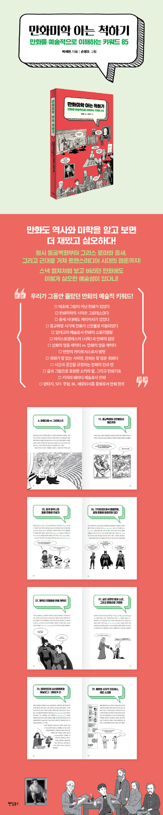 그런 점에서 이 책은 그로테스크, 캐리커처, 카툰, 스토리텔링, 캐릭터, 알레고리, 카타르시스, 기호학, 그래픽노블, 병맛, 키치, SFF, BL, 에로티시즘, 더 나아가 트랜스미디어와 웹툰까지 다양한 키워드를 통해서 만화의 예술성을 발견하게 해준다. 이 책은 조금 색다르게 보고, 조금 깊이 있게 읽고, 조금 가볍게 즐길 수 있는 만화에 대한 대중 예술 이론서다. 그동안 쉽게 보고 즐기기만 했던 스낵 컬처인 만화에도 이처럼 예술적 재미와 심오한 이야기가 있구나, 라고 생각하는 계기가 될 것이다.