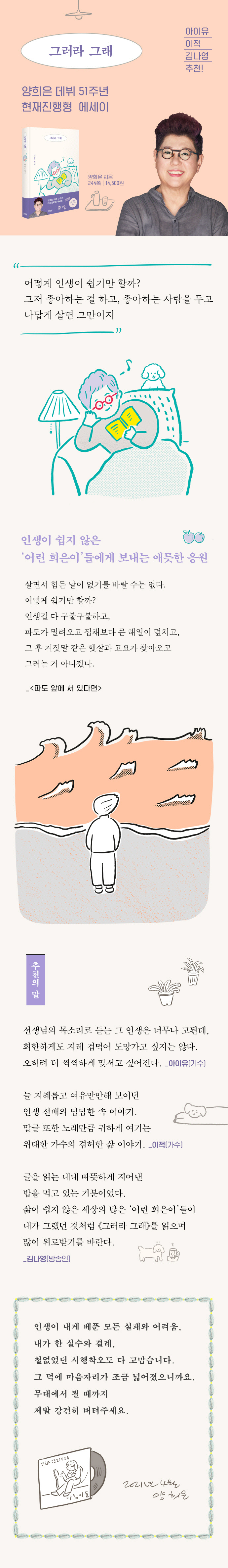 “그러라 그래”, “그럴 수 있어” 어떤 근심도 툭 털어버리는 양희은의 말처럼, 이 책에는 ‘쉽지 않은 인생을 정성껏 잘 살아보고 싶게 만드는 애틋한 응원’이 담겨 있다. 좋아하는 걸 하고, 좋아하는 사람을 두고 나답게 살아가는 양희은의 인생 이야기를 전한다.