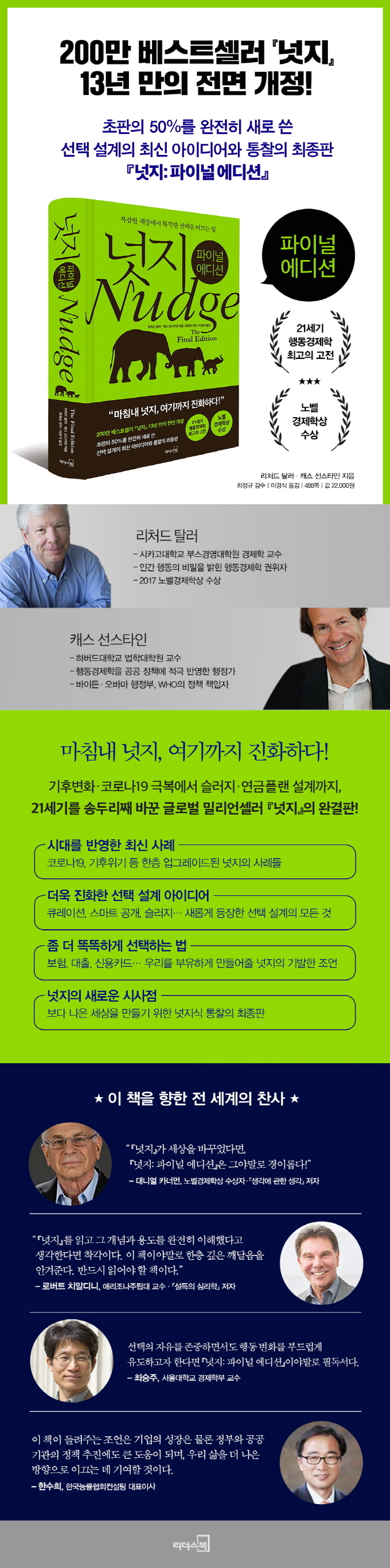 이번 파이널 에디션은 사회적 넛지를 생생하게 보여준 코로나19 팬데믹을 비롯해 국제사회에서 시급한 현안이 되어버린 기후변화 등 시대를 반영한 최신 사례를 넘나들며 한층 더 확장된 넛지의 세계로 독자들을 안내한다. 또 슬러지·큐레이션·스마트 공개·맞춤형 기본 설정 등 새롭게 등장한 선택 설계 아이디어들을 소개하고, 저축·보험·대출처럼 실생활에서 개인의 의사 결정과 밀접하게 연관된 주제들도 한층 더 날카롭게 파고든다. 이와 함께 퇴직연금과 의료보험, 장기 기증 등 공공 정책 설계에 있어서 적용된 넛지와 그 효과를 되돌아보고 앞으로의 넛지를 고민한다.