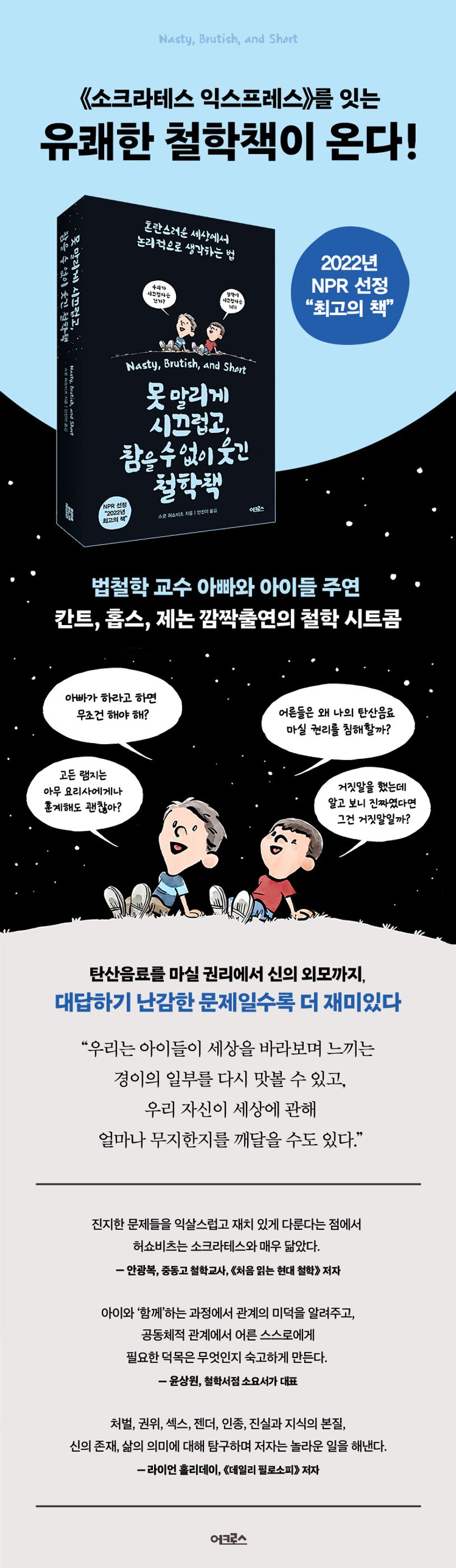 *이 책의 원제인 “불결하고, 잔인하고, 짧은(Nasty, Brutish, and Short)”은 철학자 토머스 홉스가 자연 상태를 묘사한 문구에서 따온 것이다. “만인의 만인에 대한 투쟁”인 자연 상태의 삶은 “고독하고, 빈곤하며, 불결하고, 잔인하고, 짧다”는 것이다. 저자는 어린아이들이 있는 집의 모습이야말로 “만인의 만인에 대한 투쟁”이라고 생각하여 홉스의 표현을 제목으로 사용하였다. 아이들은 “불결하고, 잔인하고, 키가 작다(Nasty, Brutish, and Short)”. 한국어판 제목은 저작권자의 승인을 받아 《못 말리게 시끄럽고, 참을 수 없이 웃긴 철학책》으로 수정했다.