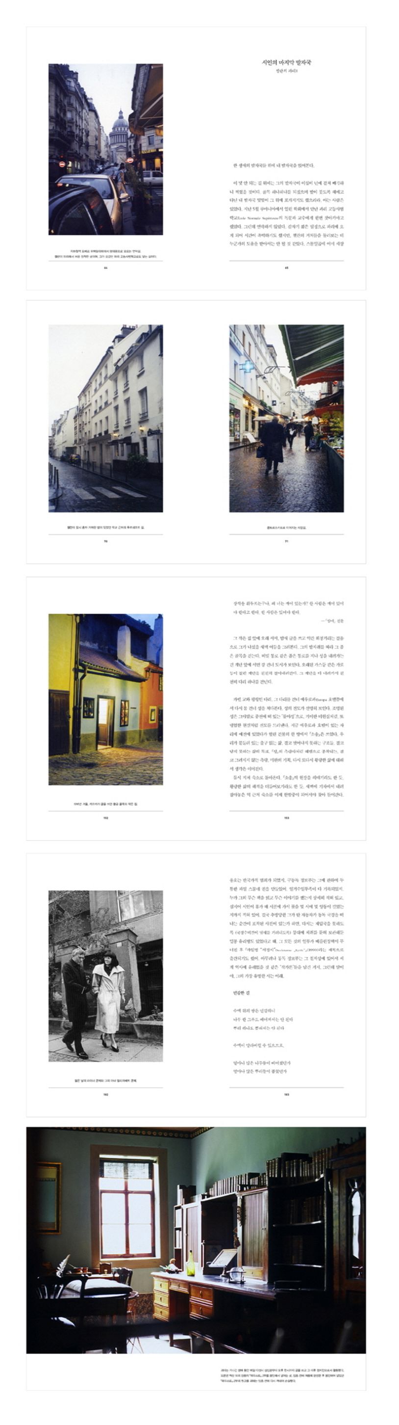어느 겨울날 시인 파울 첼란의 자취를 찾아 파리의 길들을 더듬어 걸을 때였다. 첼란이 오가던 길에 선명히 찍힌 그의 발자국 아래 거의 언제나 또하나의 희미한 발자국이 겹쳐 찍혀 있었다. 아마도 그래서였을 것이다. 첼란의 자취를 기록하고 나서도 마음이 자주 파리의 거리들을 되짚어 걸었던 것은.(255쪽)