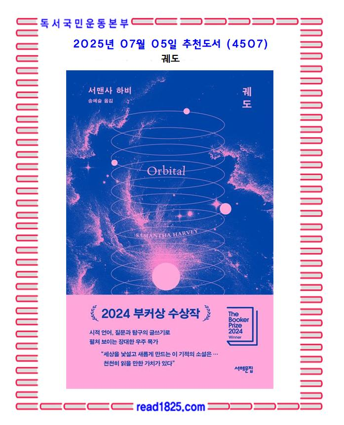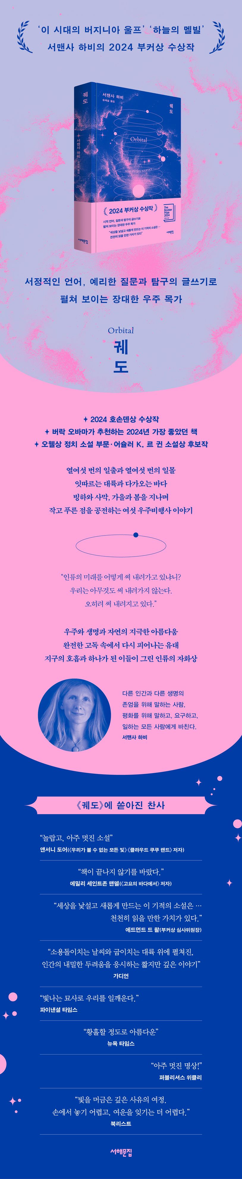 심사위원 만장일치로 2024년 부커상을 수상했고 퓰리처상 수상 작가 앤서니 도어, 오늘날 가장 주목받는 SF 작가 에밀리 세인트존 맨델이 호평했으며 버락 오바마 전 대통령이 ‘2024년 가장 좋았던 책’으로 추천한 소설. 우주정거장에서 지구를 공전하는 여섯 우주비행사의 하루에 대한 이야기다. 미 항공우주국(NASA)·유럽 우주국(ESA) 자료와 우주인의 실제 경험을 바탕으로 이 소설을 집필한 작가 서맨사 하비는 우주선에서의 일상과 한 번도 본 적 없던 우리 행성의 모습을 생생하고 섬세하게 묘사한다. 포크와 나사와 전선과 부푼 침낭이 떠 있는 모듈 내부, 기상 데이터를 수집하고 과학 실험을 하는 우주인, 한없이 새카만 우주와 빽빽한 별, 라일락 오렌지 아몬드 연보라 하양 빨강이 뭉크러진 지구를 아름답고 서정적인 언어로 리드미컬하게 펼쳐 보인다.