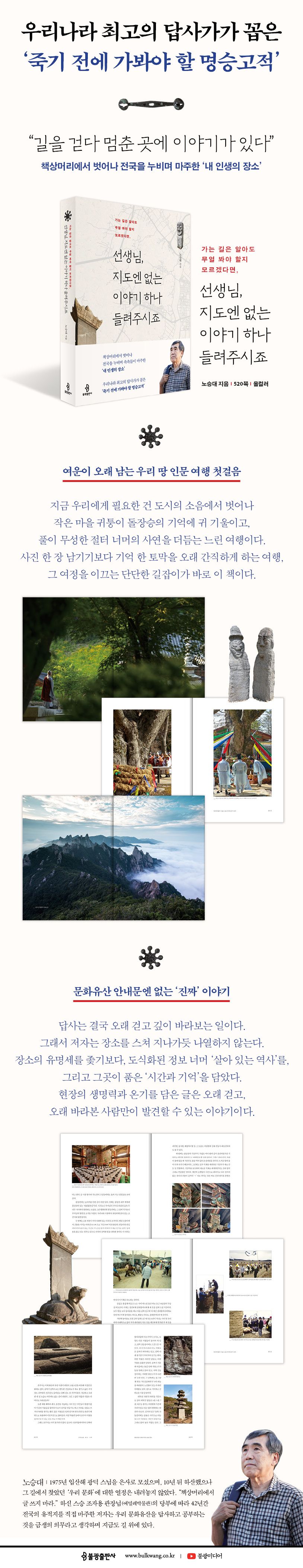 『사찰에는 도깨비도 살고 삼신할미도 산다 』 , 『사찰 속 숨은 조연들』, 『사찰에 가면 문득 보이는 것들』 등으로 우리 사찰 문화의 또 다른 면모를 조명해 온 저자는 이번 저서 『선생님, 지도엔 없는 이야기 하나 들려주시죠』를 통해 그간 전국을 두루 답사하며 발견한 ‘내 인생의 장소’에 관해 기록했다.