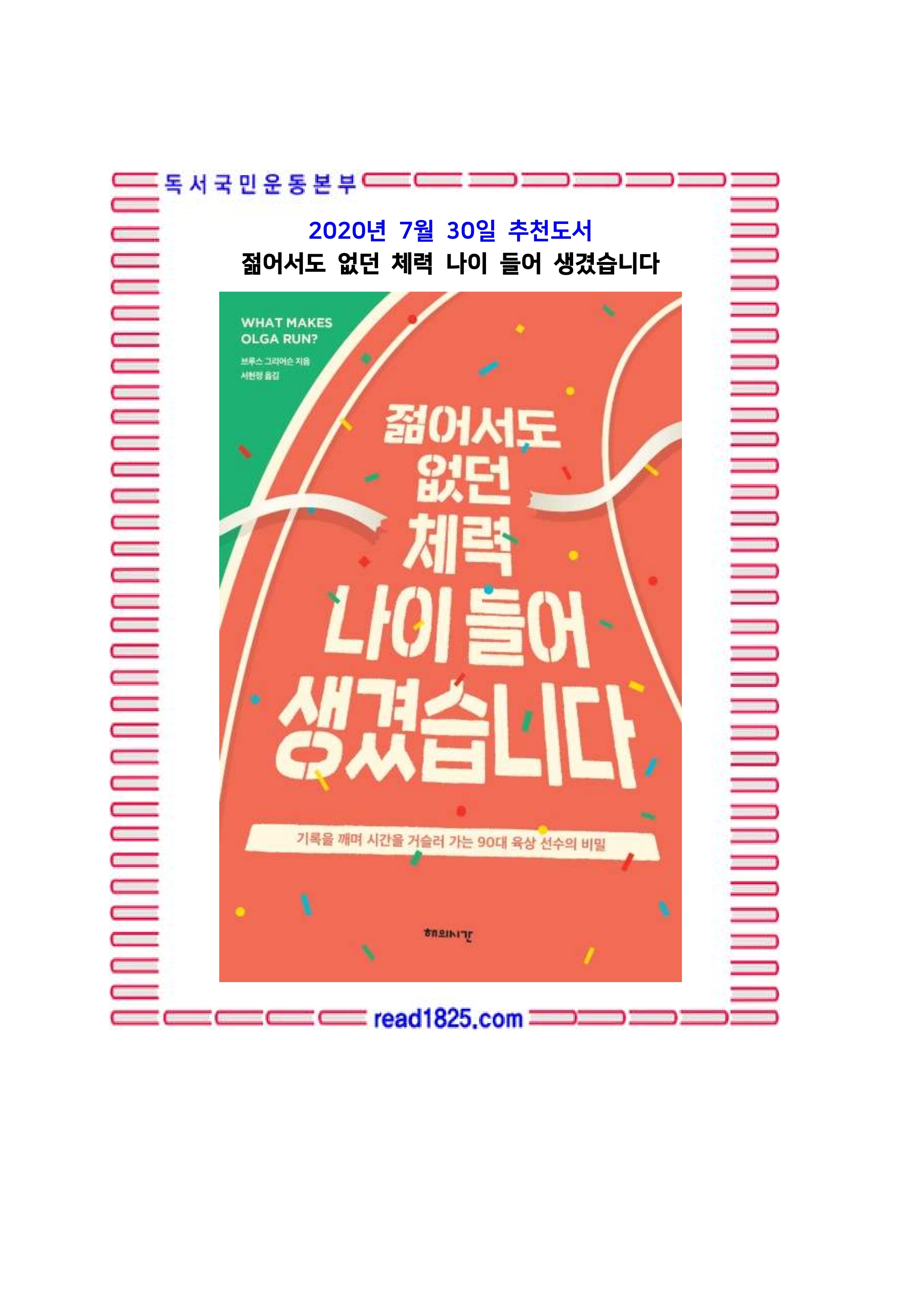 〈뉴욕 타임스〉 매거진, 〈사이언티픽 아메리칸〉 등에 기고한 캐나다 프리랜서 작가인 브루스 그리어슨은 늦깎이 육상 선수로 한창 활약 중인 94세 할머니 올가 코텔코를 몇 년 동안 바짝 따라다니며 그가 먹고, 교제하고, 훈련하고, 경쟁하는 것을 지켜보았다. 그 끝에 늙지 않는 비밀을 찾았다. 자신을 포함한 전 세계 베이비붐 세대가 노년을 맞이하는 데 도움이 되기를 바라는 마음으로 올가 코텔코라는 자그마한 노인의 놀라운 활약과 건강한 생활의 비결을 책으로 완성했다. 이 책은 중년뿐 아니라 앞으로 머지않은 미래에 나이 들어갈 자신의 모습이 궁금한 독자, 죽을 때까지 즐겁고 건강하게 살고 싶은 모든 독자에게 영감을 줄 것이다.