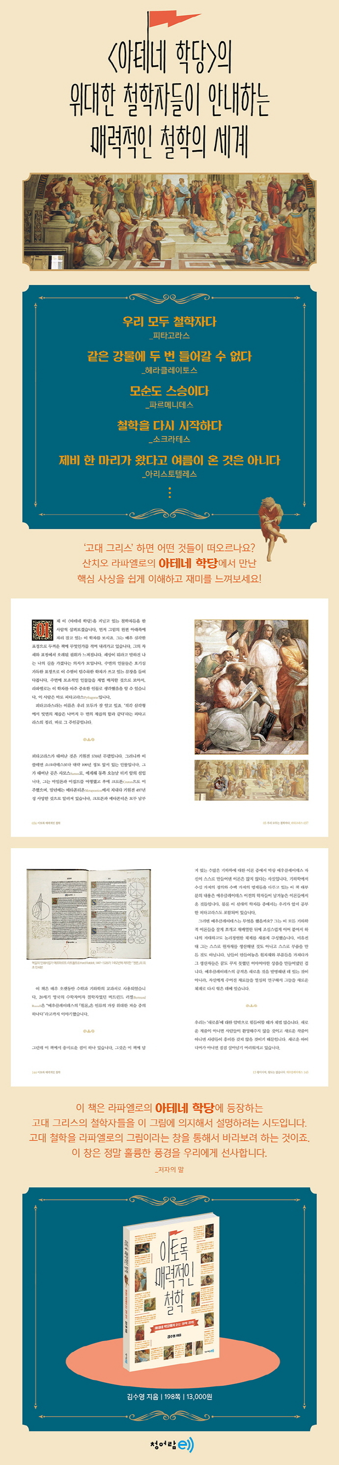 르네상스 시대를 대표하는 화가 라파엘로가 그린 벽화인 〈아테네 학당〉 속에 등장하는 고대 그리스의 철학자들을 좇아, 그들이 펼치는 매력적인 고대 철학의 세계로 안내하는 책이다. 이론적인 추상성을 극단으로까지 몰고 가는 철학이라는 주제를, 그것도 진부하고 고리타분할 것만 같은 고대 그리스의 철학을 라파엘로의 〈아테네 학당〉이라는 그림을 통해 바라본다면 어떠한 풍경과 마주하게 될까? 저자와 함께 〈아테네 학당〉 속에 숨겨진 고대 철학자들의 놀라울 만큼 많은 상징과 세심한 표현을 찾아가며 그렇게 그려진 이유를 하나씩 함께 살피다 보면, 어느새 철학이 흥미로운 소설처럼 친숙하게 다가설 것이다.