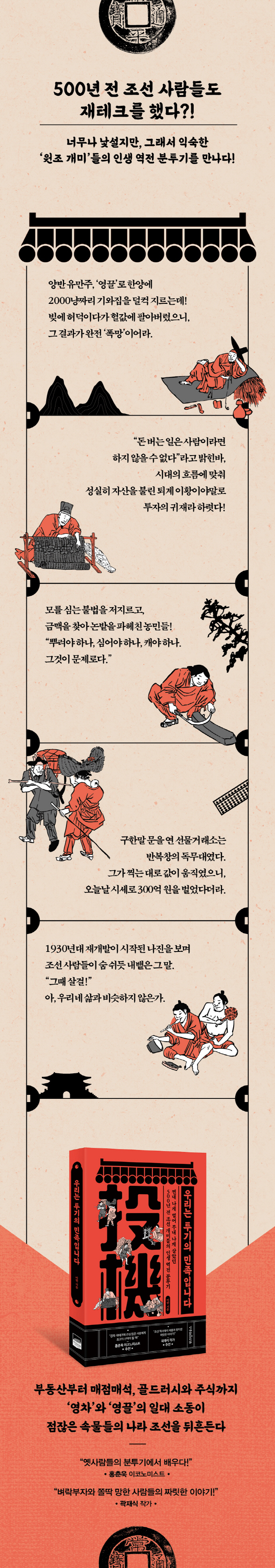 저자는 《조선왕조실록》 《비변사등록》 《승정원일기》 같은 조정의 공식 기록부터 이황의 편지, 노상추의 일기 같은 개인의 기록까지, 사료의 바다에서 돈과 관련된 온갖 소동을 샅샅이 건져냈다. 역사 전공자로서의 치밀함과 스토리텔러로서의 생생함을 겸비한 저자의 손을 거쳐 복원된 이야기들을 살펴보면, 조선은 가히 ‘재테크의 나라’라 불릴 만했다. 개국 후에는 부동산 열풍이 한양을 휩쓸었고, 몇몇 상인 집단은 매점매석으로 큰돈을 벌어 유통 공룡이 되었다. 동시에 투자의 품격을 보여준 성리학자가 존재했으며, 일제강점기에는 주식 지옥도가 개항 도시 인천에 펼쳐졌다.