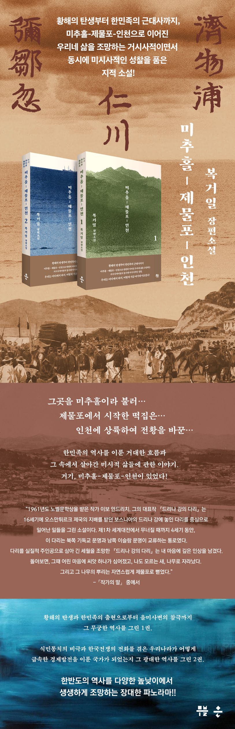 그 도도한 역사는 삼국시대와 통일신라, 고려와 조선의 성립과 붕괴의 과정을 차례로 거치고 일제강점기의 가혹한 시절을 겪은 후, 전쟁의 폐허 속에서 순식간에 경제 강국으로 다시 우뚝 서는 근대화의 역사에까지 가 닿는다. 그사이 만석과 월례의 후손들은 역사의 격랑 속에 흩어지고 재회하고 때로 얄궂은 운명의 장난조차도 담담히 받아들이며 인천에서 삶을 이어간다. 개항과 일제강점기, 해방정국과 한국전쟁을 모두 겪은 후 다시 발전해 나가는 대한민국의 운명을 몸소 겪고 지켜보는 이 일가의 가족사는 지금을 살아가고 있는 우리 모두의 근원을 새삼 탐색하게 만든다.