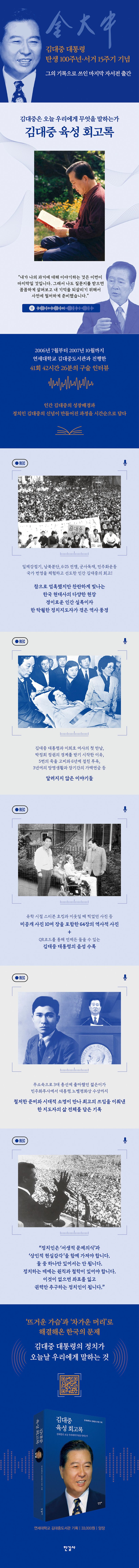 『김대중 육성 회고록』은 김대중 전문 연구자들과의 인터뷰 형식으로 된 유일한 자전적 성찰이자 기록이다. 김대중 대통령은 연세대학교 김대중도서관 연구진들과 2006년 7월부터 2007년 10월까지 41회 42시간 26분의 구술 인터뷰를 진행했고 그 결실이 바로 『김대중 육성 회고록』이다. 이 책에는 김대중 대통령만이 증언할 수 있는 경이로운 인간 실록이자 한 탁월한 정치지도자가 겪은 역사 풍경이 담겨 있다. 소년기와 청년기, 해방 전후와 6·25 전쟁을 겪으면서 시대와 사회를 통찰하는 그의 생각과 신념이 어떻게 형성되었는지 다룬다. 자유당과 이승만의 독재 시절, 4·19 혁명을 겪으면서 정치에 나서고, 박정희 쿠데타와 유신 선포 속에서 죽음을 딛고 민주화운동에 헌신한다. 다시 전두환 신군부의 등장과 수난받는 민중의 역사 속에서, 결코 좌절하지 않고 분연히 일어서는 큰 정치인 김대중의 행로는 참으로 경이롭다.