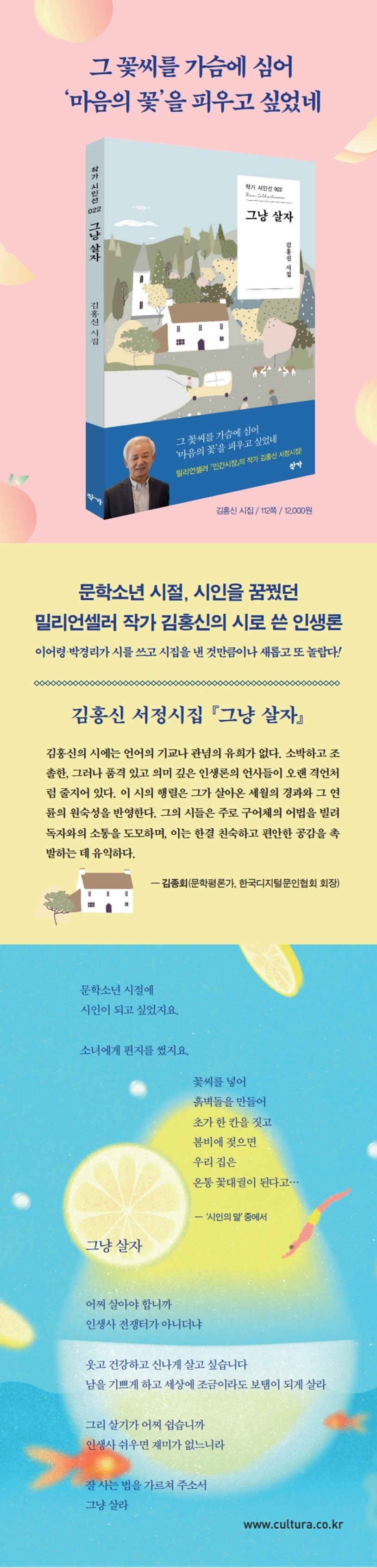 밀리언셀러 『인간시장』의 작가 김홍신이 서정시집 『그냥 살자』를 작가 시인선으로 출간하였다. 이는 이어령과 박경리가 시를 쓰고 시집을 낸 것만큼이나 새롭고 또 놀랍다.