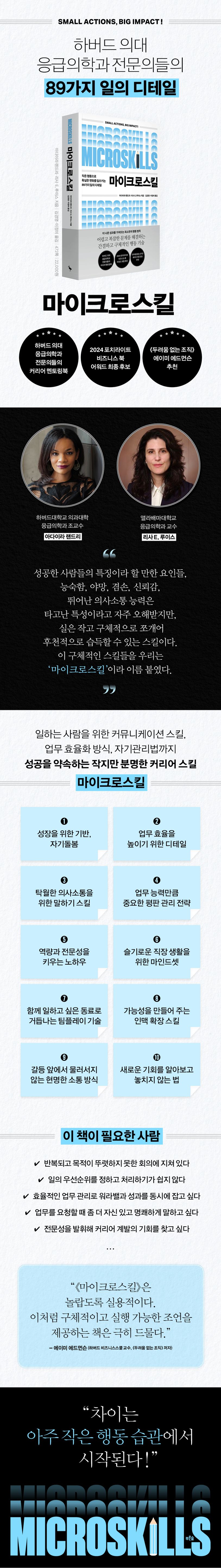 하버드 의과대학교 응급의학과 조교수 아다이라 랜드리와 앨라배마대학교 응급의학과 교수 리사 E. 루이스가 공동 집필한 《마이크로스킬》은 성공한 사람들의 특징이라 할 만한 요인들은 타고나는 것이 아니라 작고 구체적으로 쪼개어 계발할 수 있다고 말한다. 하버드 의과대학교에서 수학하고 학생들을 가르치는 두 저자는 그 어느 곳보다 위급한 문제가 많이 발생하는 응급실에서 다양한 유형의 케이스를 경험하고, 다른 부서 의사들과 협업해왔다. 그러나 일이 매끄럽게 진행되지 않고 신입 직원이 빠르게 적응하지 못하는 현상에 주목한 두 사람은 성과를 이끌어 내는 행동 습관들을 모아 《마이크로스킬》을 집필했다. 이미 수많은 의대생과 멘티에게 효용을 입증 받은 커리어스킬을 모은 이 책은 ‘일의 우선순위 정하기’ ‘목적이 분명한 회의하기’ ‘구체적이고 실행 가능한 피드백 주고받기’와 같이 누구나 따라 해 볼 수 있는 89가지 행동 습관인 마이크로스킬을 실질적인 사례와 함께 소개하며, 간결하고 구체적인 행동이 가져오는 변화의 힘을 강조한다.