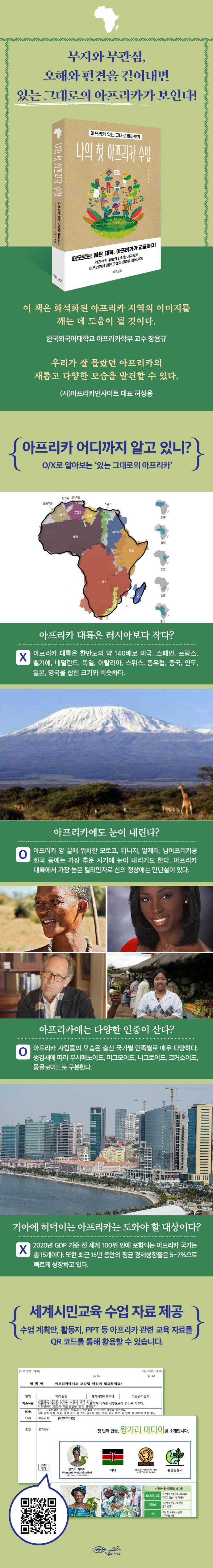 더 포용적이고 정의롭고 평화로운 세상을 만들기 위해 필요한 세계시민의식이 글로벌 교육목표로 떠오르고 있다. 차별과 배제의 대상이 아닌 현재와 미래의 파트너로 아프리카를 바라보는 시각은 세계시민으로 한 발짝 나아가는 데 도움이 된다. 세계시민의 눈으로 아프리카를 바라본다면 차별과 배제의 대상이 아닌 아프리카 국가들이 지닌 잠재력과 가치를 발견할 수 있을 것이다. 현재와 미래의 파트너인 아프리카에 대한 객관적인 사실과 정보가 담겨 있는 이 책의 내용을 바탕으로 만든 세계시민교육 수업계획안과 활동지 등은 책에 제공된 QR코드 또는 웹페이지(https://www.notion.so/africainsight/1-35c1f6dd8b1f48b2966e5a7bce76e5d4)를 통해 얻을 수 있다. 이를 통해 아프리카에 대한 다양한 토론과 교육이 학교를 비롯한 사회 각계각층에서 이루어지기를 바란다.