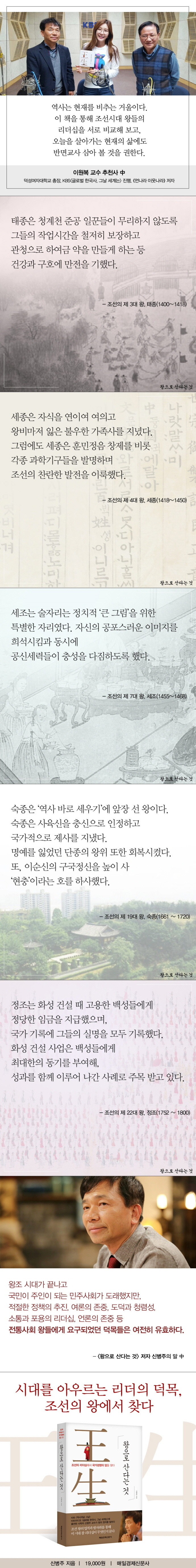 이 책은 〈매경이코노미〉에 연재한 ‘왕으로 산다는 것’ 칼럼의 전체 내용을 모은 것이다. 태조부터 순종까지 조선의 27명 왕 대부분을 언급하고 있다. 왕이 되기까지의 과정, 왕의 가족, 왕이 된 후의 정책, 조언을 받은 참모, 왕의 라이벌 등 왕의 주변 인물이나 주요한 사건들의 면모를 모두 담으려고 노력했다. 조선의 왕은 고대나 고려의 왕들에 비해 절대적인 권력을 누리지는 못했다. 제도가 정비되면서 왕을 견제하는 장치도 적절히 운영되었기 때문이다. 조선시대 정치사에서 큰 축을 차지하는 왕권과 신권의 문제는 결국 왕권을 누가 어떤 방식으로 행사하느냐에 따라 갈등의 양상을 보이기도 하고 조화를 이루기도 했다. 세종과 같은 왕이 절대 권력을 휘두르지 않으면서도 자신의 뜻에 맞게 강력한 정치력을 발휘할 수 있었던 배경에는 왕권과 신권의 조화를 이루었던 측면이 크다.