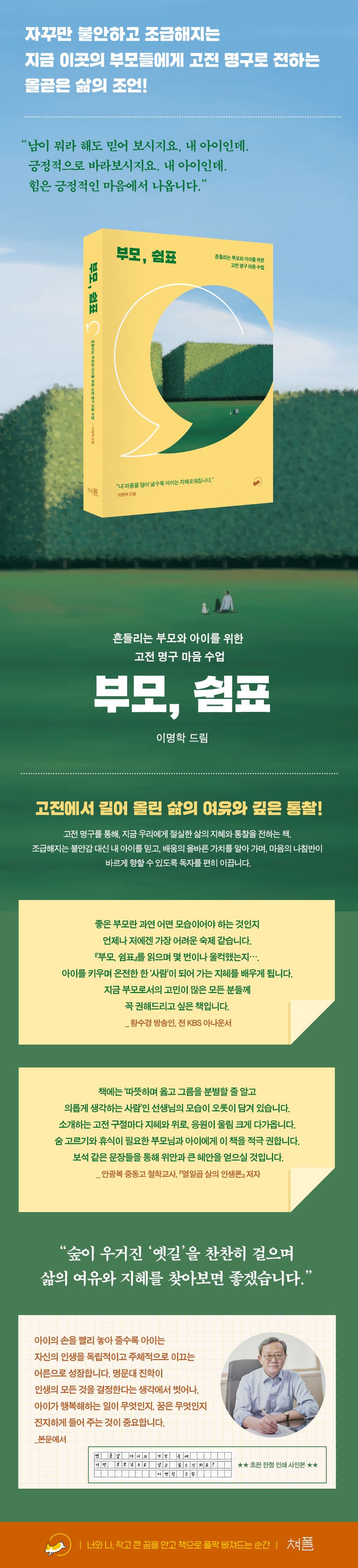 한 번의 성적으로 앞으로 살아갈 창창한 인생길이 정해질 리 없음을 누구보다 인생 선배인 우리들이 더 잘 알고 있다. 그래서일까, 밤하늘에 반짝이는 별들의 모양도 크기도 제각각이듯 모든 아이가 살아갈 모든 삶의 방향을 응원하고 든든히 지켜보자는 저자의 제안이 큰 울림으로 가슴 깊이 다가온다. 커다란 것, 작은 것, 둥근 것, 찌그러진 것, 심지어 부서진 조각도 있으나 모양이나 크기가 어찌 되었든 모두 밤하늘에서 빛을 내며 반짝이듯이 아이가 지닌 그 고유한 ‘빛’을 존중해 주자고. 비단 아이들뿐일까. 『부모, 쉼표』를 읽는 동안 우리 안에도 저마다 희망과 긍정의 씨앗이 반짝, 담기게 될 것이다.