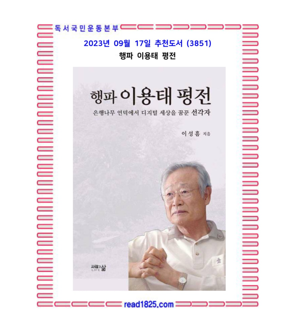 우리도 각자의 처지에 맞게 회장님처럼 살아간다면, 자신도 성취의 보람을 느끼고 주위로부터 존경을 받게 되어 더 기쁘고 더 건강해질 것이 자명합니다. 이 책 《杏坡행파 李龍兌이용태 評傳평전》은 이 회장님이 다양한 분야에서 대한민국의 정보산업을 가꾸는 과정에서 그가 겪은 다양한 이야기를 비롯하여 효제충서孝悌忠恕로 체화된 생활철학에서 배어나는 다양한 삶의 일화逸話로 구성되어 있습니다. 이 책을 권하는 진정한 까닭은 독자 여러분이 이 책을 통하여 삶의 현장에서 자신의 처지에 맞는 삶을 꾸려나가는 방법을 찾을 수 있다고 생각하기 때문입니다.