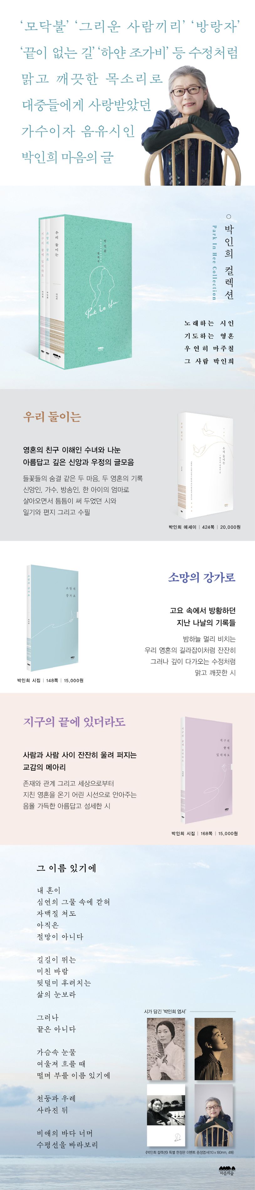노래하는 시인. 기도하는 영혼. 우연히 마주칠 그 사람 박인희. ‘모닥불’ ‘그리운 사람끼리’ ‘방랑자’ ‘끝이 없는 길’ ‘하얀 조가비’ 등 수정처럼 맑고 깨끗한 목소리로 대중들에게 사랑받았던 가수이자 음유시인.