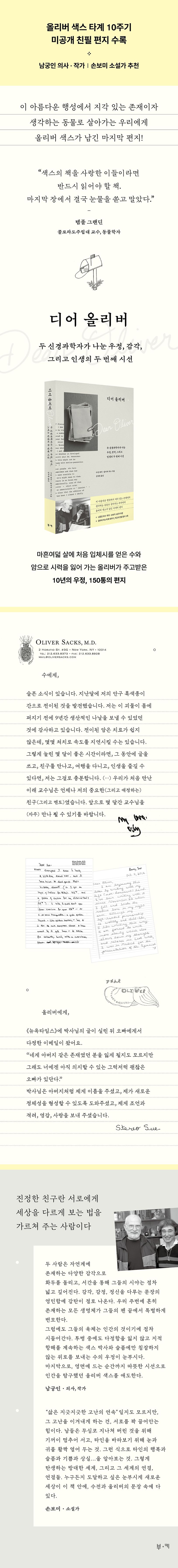 《디어 올리버》는 그렇게 10년간 150통이 넘는 편지를 주고받으며 서로에게 세상을 다르게 보는 법을 가르쳐 준 두 신경과학자의 서간집이자, 이제는 홀로 남겨진 이가 먼저 떠난 이를 추억하고 그리워하며 써 내려간 회고록이다.