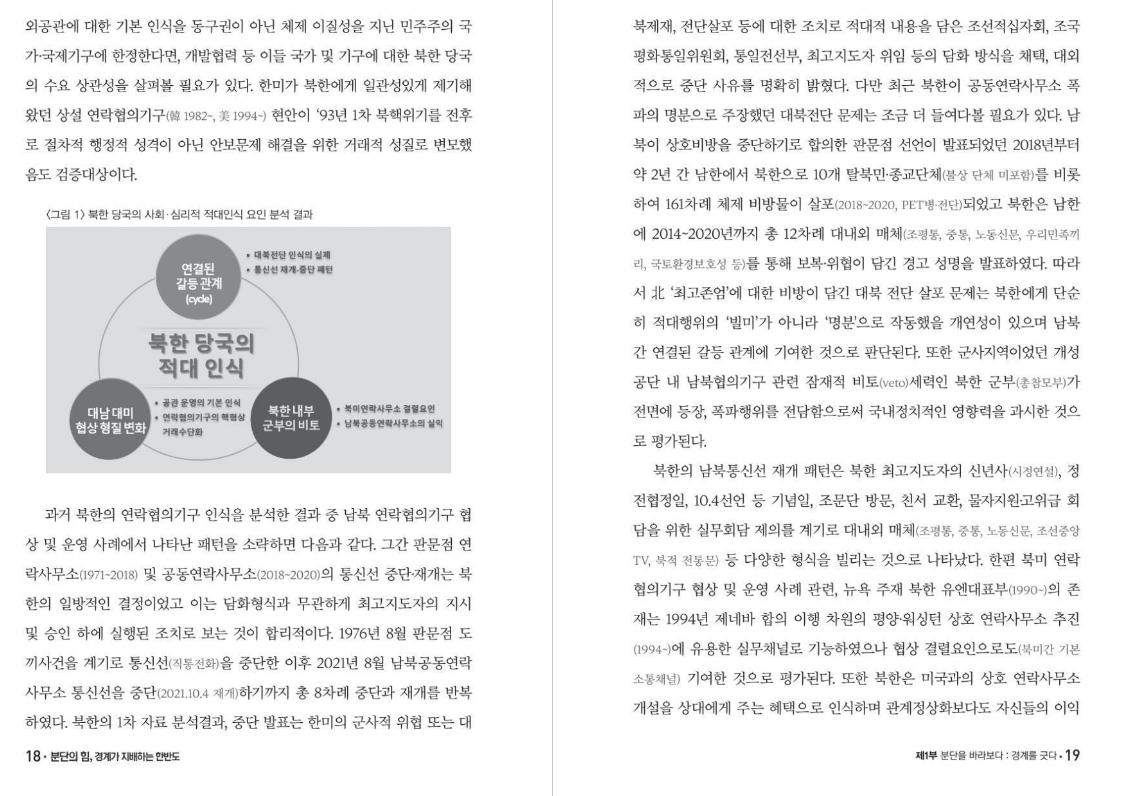 제1부는 분단에 대한 경계적 시선을 다루고 있다. 먼저 저자가 통일부 서기관 시절 상주대표로 근무했고 임기 후에는 학자로서 미완의 숙제로 받아든 개성 남북공동연락사무소 문제로 시작하여 오래된 남북한 숙적관계의 특질을 다루고 있으며, 한반도에 숙적관계가 종식되지 못하는 구조적 요인 중의 하나로 동맹관계를 조명하고 있다.