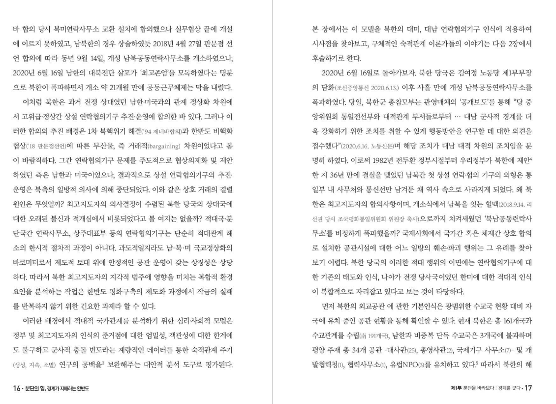 제2부는 북한에 대한 규범적 시선이다. 언론 등에 피상적으로 비추어진 북한이 아닌 ‘조선민주주의인민공화국’의 체제적 강고함과 시장화 현상에서부터 최근 북한이 중시하는 UN의 SDGs(지속가능발전목표) 현황과 북한 개발협력 연구를 위한 제언에 이르기까지 분단과 통일의 대상인 북한에 대한 관심을 정치, 경제 그리고 국제사회의 규범적 관점에서 환기시키고 있다.